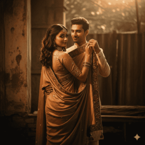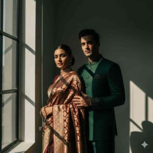 4. “Aesthetic retro-style couple photo, traditional saree with intricate patterns, classic ethnic suit for the man, moody sunlight, minimalist editorial fashion vibe.”