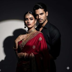 2. “Romantic couple portrait in dramatic spotlight, woman in a deep red saree with golden jewelry, man in a black shirt, intense expressions, high-contrast cinematic shadows, Vogue-style editorial photo.”