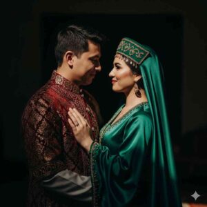 5. “Couple in traditional attire standing close, soft warm spotlight on their faces, background in shadow, cinematic contrast, Instagram editorial look.”