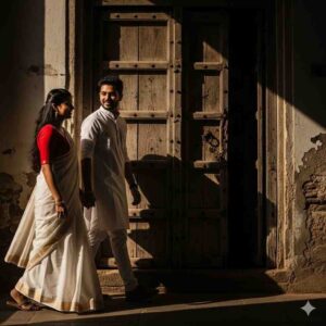 3. “Couple in traditional Indian outfits, woman in a white saree with red blouse, man in a white kurta, walking past an old rustic wooden door, sunlight casting strong shadows, cinematic storytelling vibe.”