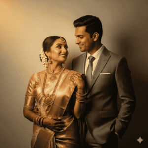 6. “Romantic Indian couple editorial portrait, woman in a silk saree with gold jewelry, man in a sharp formal suit, neutral wall background, golden retro filter, cinematic composition.”
