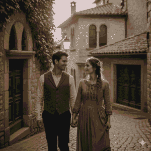 7. “Couple walking together in traditional outfits, warm natural sunlight falling across their faces, vintage tones, rustic architecture in the background, cinematic Instagram vibe.”