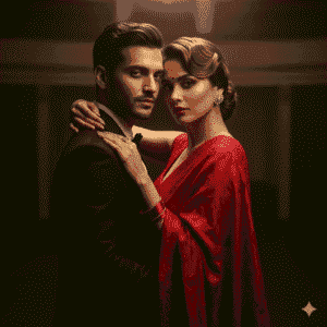 8. “Dramatic editorial couple portrait, woman in bold red saree with elegant hairstyle, man in dark formal outfit, warm spotlight glow, cinematic shadows, timeless retro romance.”