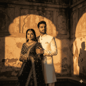 9. Elegant couple shot in traditional Indian style, old textured wall as background, golden light casting dramatic shadows, minimalist but cinematic Instagram aesthetic.”
