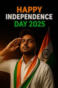 Create a picture of an Indian man saluting the Indian flag. He is wearing a white kurta with a scarf of Indian colors such as saffron, white and green wrapped around the neck. There is also an Indian flag just behind the man. The background is black in color with orange colored light coming from it which is also falling slightly on the man’s face. In which Happy Independence Day 2025 is written in a tricolor themed font. Which is on the top side of the Indian tricolor.