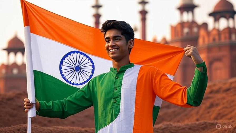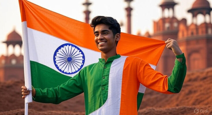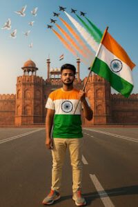 Create a realistic picture of an Indian youth standing on an empty street in front of the Red Fort. He is wearing beige pants, colorful sneakers and a T-shirt with the tricolor and Ashoka Chakra. He is holding the Indian national flag. White pigeons are flying and Indian fighter jets are creating tricolor smoke trails in the blue sky. Patriotic atmosphere, no text. Use the face and hairstyle in my reference picture.