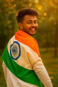 Wrapped in pride, smiling with Freedom create a vibrant portrait of a joyful young man celebrating Indian pride, wrapped in the Indian national flag (tricolor with Ashoka Chakra). He is dressed in a traditional white kurta-pajama, smiling and glancing back over his shoulder. The background features soft greenery and warm lighting, emphasizing the festive and patriotic atmosphere. High-resolution, natural colors, lively and celebratory mood, I style.