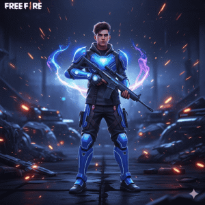 A young gamer standing in a dark futuristic battlefield with glowing blue armor, holding a Free Fire gun, surrounded by neon energy sparks, cinematic lighting, hyper-realistic style.