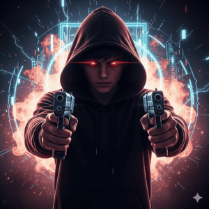 sharp Free Fire-inspired profile picture of a boy with a hoodie, glowing red eyes, holding dual pistols, surrounded by flames and neon digital effects, cyberpunk photo editing style.