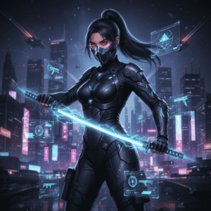 A female Free Fire assassin in black combat suit, glowing katana, neon city skyline behind, surrounded by holographic effects, ultra-stylish professional portrait.