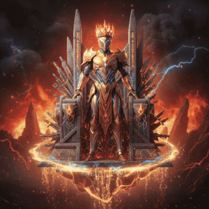 A gamer wearing Free Fire crown and golden armor, standing on a throne with glowing effects, epic fantasy lighting, fire and smoke background, realistic photo editing style.