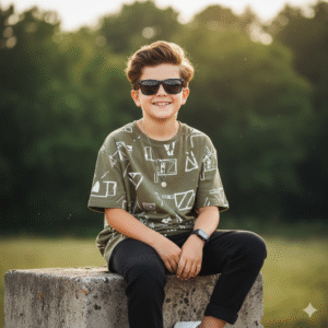 Ultra-realistic full-body portrait of a boy sitting on a concrete block outdoors, same face exactly stylish voluminous hairstyle, Wearing olive green oversized printed T-shirt, black jeans, white sneakers, black sunglasses, silver pendant chain, black wrist watch, natural happy vibe. Background soft green bokeh trees, natural daylight, warm tones, fashion photoshoot aesthetic, 8K ultra sharp detail, cinematic depth of field.