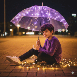 A very handsome young boy with wavy fringe hair style,sitting casually on a warm, rustic brick-paved ground at night. He is looking directly at the camera with a playful, He holds a transparent umbrella adorned with shimmering *purple LED string lights*. Warm, golden fairy lights are scattered on the ground around her, creating a brilliant bokeh effect. He is wearing a purple t-shirt full baju and black pantsand white top sneakers.4k