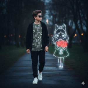 Generate A person (clearly looking his face 100% same facial features of uploaded image) in a hoodie and sweatpants walks along a path at day, looking to their right. Next to them is a glowing white outline of a cartoon girl with a bow in her hair, holding a bouquet of red roses. Boy ka same cloth and colour. The background is dark with hints of foliage and distant lights 16 sal boy 5 fit face aage Ki taraf.