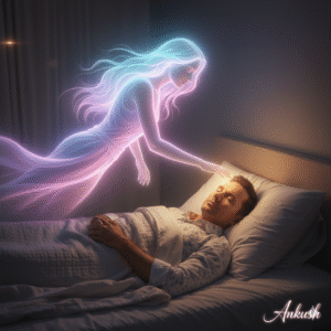 A soft, ethereal scene where a man is peacefully sleeping in his bed, partially covered by a blanket. Above him, a pink blue glowing, and costume translucent female figure with long hair gently touches his forehead with her hand. The room is dimly lit, casting warm, comforting glow. The overall mood is serene and my name logo Ankush dreamlike, with a hint of mystery or spiritual presence.” keep my face 100% same as in the reference image.