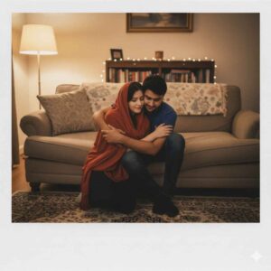 2. “Take a photo taken with a Polaroid camera. The photo should look like an ordinary photograph, without an explicit subject or property. The photo should have a slight blur and a consistent light source, like a flash from a dark room, scattered throughout the photo. Don’t change the face. Change the background behind those two people to a cosy living room with warm yellow lights. Make it look like both the people in the reference picture are sitting next to each other and hugging each other on a sofa.”