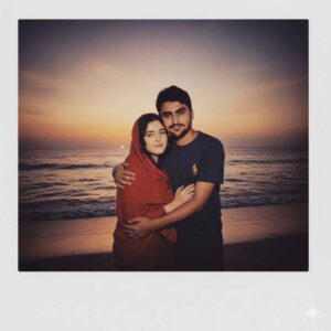 3. “Take a photo with a Polaroid camera. The photo should look like an ordinary photograph, without an explicit subject or property. The photo should have a slight blur and a consistent light source, like a flash from a dark room, scattered throughout the photo. Don’t change the face. Change the background behind those two people to a beach scene during sunset. Make it look like both the people in the reference picture are holding hands and hugging each other.”