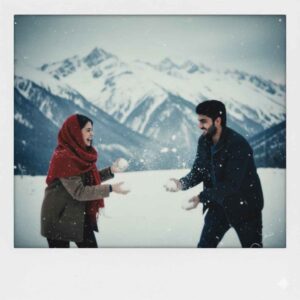 4. “Take a photo taken with a Polaroid camera. The photo should look like an ordinary photograph, without an explicit subject or property. The photo should have a slight blur and a consistent light source, like a flash from a dark room, scattered throughout the photo. Don’t change the face. Change the background behind those two people to a mountain landscape covered in snow. Make it look like both the people in the reference picture are playfully throwing snow at each other.”
