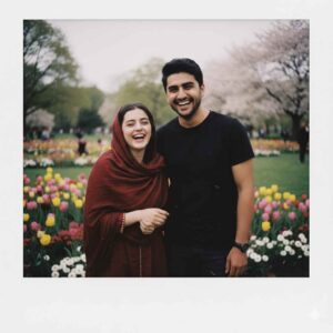 5. “Take a photo taken with a Polaroid camera. The photo should look like an ordinary photograph, without an explicit subject or property. The photo should have a slight blur and a consistent light source, like a flash from a dark room, scattered throughout the photo. Don’t change the face. Change the background behind those two people to a park full of flowers in spring. Make it look like both the people in the reference picture are laughing together.”