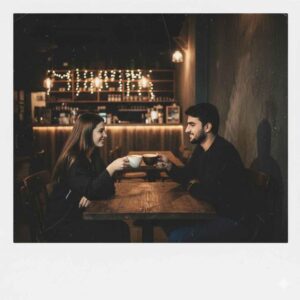 6. “Take a photo taken with a Polaroid camera. The photo should look like an ordinary photograph, without an explicit subject or property. The photo should have a slight blur and a consistent light source, like a flash from a dark room, scattered throughout the photo. Don’t change the face. Change the background behind those two people to a dimly lit café with wooden tables. Make it look like both the people in the reference picture are clinking coffee mugs.”