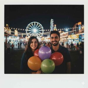 7. “Take a photo taken with a Polaroid camera. The photo should look like an ordinary photograph, without an explicit subject or property. The photo should have a slight blur and a consistent light source, like a flash from a dark room, scattered throughout the photo. Don’t change the face. Change the background behind those two people to a carnival scene full of lights and rides at night. Make it look like both the people in the reference picture are holding balloons.”