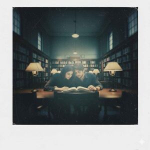 8. “Take a photo taken with a Polaroid camera. The photo should look like an ordinary photograph, without an explicit subject or property. The photo should have a slight blur and a consistent light source, like a flash from a dark room, scattered throughout the photo. Don’t change the face. Change the background behind those two people to a library full of bookshelves. Make it look like both people in the reference picture are reading a book together.”