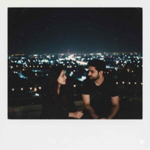 9. “Take a photo taken with a Polaroid camera. The photo should look like an ordinary photograph, without an explicit subject or property. The photo should have a slight blur and a consistent light source, like a flash from a dark room, scattered throughout the photo. Don’t change the face. Change the background behind those two people with a rooftop terrace at night with city lights. Make it look like both the people in the reference picture are sharing a quiet conversation.”