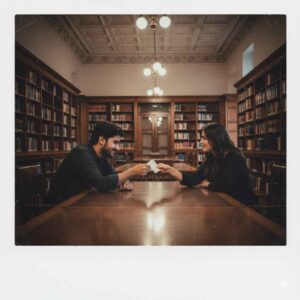 10. “Take a photo taken with a Polaroid camera. The photo should look like an ordinary photograph, without an explicit subject or property. The photo should have a slight blur and a consistent light source, like a flash from a dark room, scattered throughout the photo. Don’t change the face. Change the background behind those two people to a library reading room with soft overhead lights. Make it look like both the people in the reference picture are exchanging a secret note.”