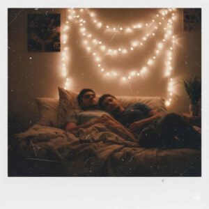 11. “Take a photo taken with a Polaroid camera. The photo should look like an ordinary photograph, without an explicit subject or property. The photo should have a slight blur and a consistent light source, like a flash from a dark room, scattered throughout the photo. Don’t change the face. Change the background behind those two people to a cosy bedroom with fairy lights on the wall. Make it look like both the people in the reference picture are lying next to each other.”