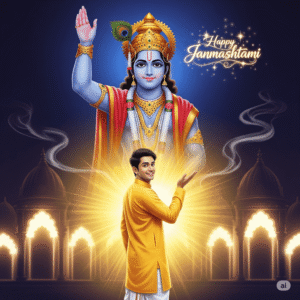 A young man in a traditional yellow kurta and white pajama, smiling and glancing back over his shoulder in a blessing pose, surrounded by a radiant golden aura. Above him, a majestic vision of Lord Krishna in a sambhal-blue tone, adorned with full jewelry, raising his right hand in blessing. Background: glowing temple arches, drifting incense smoke, and ‘Happy Janmashtami’ in sparkling celestial text.