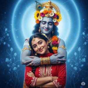 Lord Krishna with serene smile, sambhal-blue skin, long wavy dark hair, golden crown with peacock feathers, and fresh flowers (sunflowers, marigolds, daisies). He hugs a young woman from behind. Krishna wears golden jewelry; the woman, in a red kurta with white embroidery, smiles warmly with arms crossed. Background: dreamy blue aura with floral motifs, soft cinematic lighting.