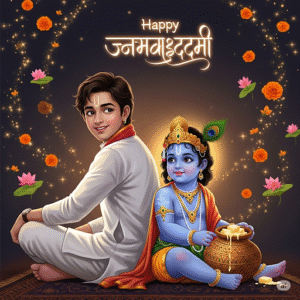A young man in white kurta-pajama, sitting cross-legged, smiling and glancing back. Beside him sits Baby Krishna with glowing blue skin, peacock feather crown, golden jewelry, and butter pot. Background: floating marigold and lotus flowers, golden sparkles, glowing script reading ‘Happy Janmashtami.’ Warm lighting, semi-realistic painting style.