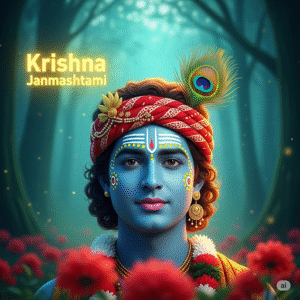 Ultra-realistic artwork of a young man styled as Lord Krishna, with bright sambhal-blue skin, red patterned headband with golden peacock feather, sacred tilak, dotted face paint, single earring, and pink lips. Background: dreamy teal-green forest with soft blur depth, vibrant red foreground flowers, cinematic lighting. Text overlay: ‘Krishna Janmashtami’ in glowing yellow 3D style. Ensure facial features match the uploaded image reference.