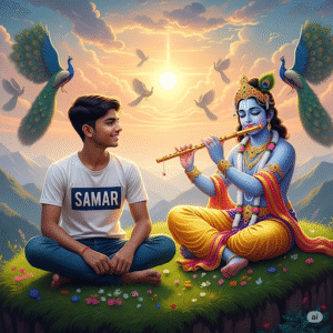A 20-year-old Indian boy named *Samar* (name clearly printed on his T-shirt) sits barefoot next to Krishna ji on a mountain. Krishna plays the flute gracefully. Background: a heavenly landscape with glowing skies, peacocks dancing, and soft divine light.