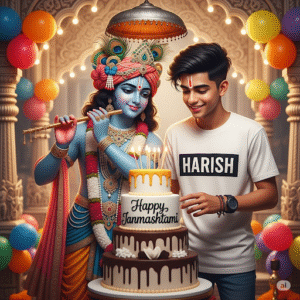 Lord Krishna joyfully cuts a birthday cake with “Happy Janmashtami” written in big clear letters. Next to him stands an 18-year-old boy named *Harish*, wearing a white T-shirt with his name clearly written, bracelets, a watch, and stylish black hair. Scene: inside a decorated love temple glowing with lights and balloons.