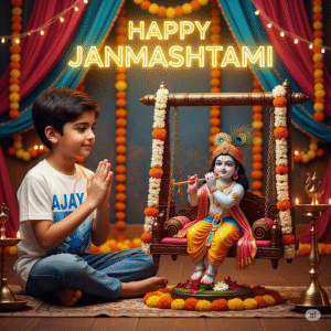 A boy named *Ajay* (name clearly visible on his T-shirt) is worshiping Krishna ji. Krishna sits on a swing, playing the flute. Behind them, “Happy Janmashtami” appears in bold glowing text. Divine ambiance, realistic details, festive background.