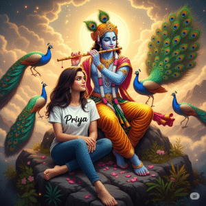 A 20-year-old Indian girl named *Priya* (name clearly visible on her T-shirt) sits barefoot next to Krishna ji on a mountain. Krishna plays the flute as peacocks dance nearby. Background: a glowing, heaven-like landscape filled with divine light.