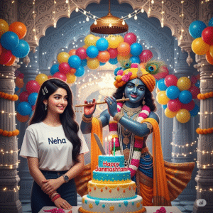 Lord Krishna cuts a birthday cake with “Happy Janmashtami” written clearly on it. Next to him stands an 18-year-old girl named *Neha*, wearing a white T-shirt with her name visible, bracelets, watch, and stylish black hair. Scene: inside a beautifully decorated temple with balloons and lights.
