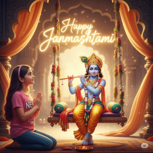 A girl named *Neha* (name on T-shirt clearly visible) worships Krishna ji. Krishna sits on a divine swing, playing the flute. Background: glowing “Happy Janmashtami” text, warm heavenly lighting, ultra-realistic rendering.