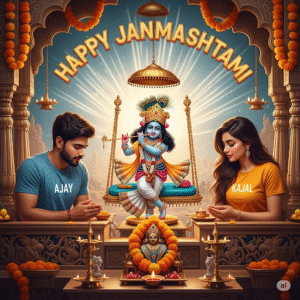 A 20-year-old couple worships Krishna ji together. Krishna sits on a swing, playing the flute. The boy wears a T-shirt with *Ajay* written clearly, and the girl wears a T-shirt with *Kajal* written clearly. Background: radiant heavenly glow with bold text “Happy Janmashtami,” temple decorations, and divine atmosphere.