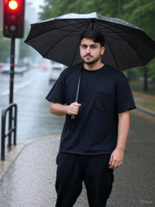 Wearing an oversized black t-shirt, black box pants, snekers.using an umbrella on the sidewalk about to cross the road at a red light, many trees, beside the sidewalk.heavy rain. Ratio 9:16