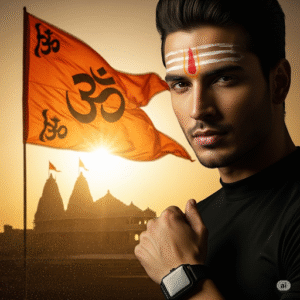 Ultra-realistic 8K portrait of a confident young Hindu man with sharp features, calm yet powerful expression, and a red tilak on his forehead. He wears a modern outfit (black or white shirt, modern black wristwatch), no religious attire. Behind him, a large saffron Hindu flag (Bhagwa Dhwaj with Om symbol) waves in the wind. The background glows with warm golden sunlight and faint silhouettes of ancient Hindu temples. Cinematic studio-style atmosphere with textured golden particles blending into deep shadows. Shot on an 85mm lens, shallow depth of field, professional fashion editorial lighting, dramatic highlights and shadows.