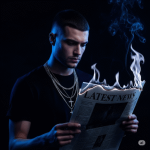 Portrait of a young man in a black shirt with layered silver chains, standing against a pure black background. He holds a newspaper labeled *LATEST NEWS*, its corner burning with stylized blue flames and faint smoke drifting upward. The fire illuminates his face and hands with eerie blue highlights, creating a cinematic, moody atmosphere. His expression is serious and contemplative as he looks down at the burning paper. Ultra-realistic, dramatic editorial style, deep contrast, mysterious vibe.