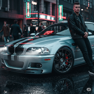 A young man (keep exact facial features and skin tone) leans confidently against his customized BMW E46 M3 with a modern silver-blue street racing paint job. The scene is set in the middle of a busy Phaka city road with blurred pedestrians rushing past in motion. Inspired by street racing video games like *Need for Speed*, with a gritty, urban, high-energy aesthetic. Ultra-realistic, cinematic atmosphere with glowing city lights reflecting on the car.