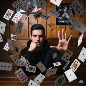 A young man with dark hair (maintain exact facial features and skin tone) wearing a black hoodie sits in a rustic wooden booth. He stares intensely at the camera, one hand supporting his chin, the other reaching forward as if channeling telekinesis. Dozens of playing cards hover and swirl around him, captured in dynamic slow motion with motion blur. The wooden-paneled background includes a framed photo of a man playing cards. Cinematic, ultra-realistic, with dramatic focus on the floating cards.