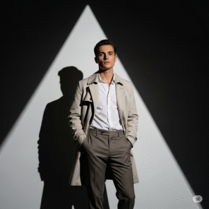 A stylish young man in a cream trench coat over a white button-up shirt and taupe trousers, standing confidently with hands in pockets. A sharp triangular beam of light is projected behind him, casting bold shadows on the wall. His expression is calm, confident, and editorial. Shot in ultra-high resolution with dramatic, minimalistic fashion lighting, cinematic and modern in style.