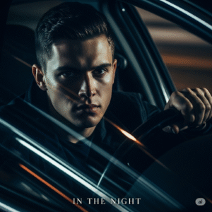 A young man (face exactly matching the uploaded image) sits behind a car steering wheel with a serious expression. His face is partially shadowed, lit with harsh contrast from streetlights. Captured through the car window in a “Neo-noir” thriller style, with high contrast, shallow depth of field, cinematic reflections on the glass. Ultra-realistic, moody atmosphere. At the bottom of the frame, subtle elegant text reads: *IN THE NIGHT*.